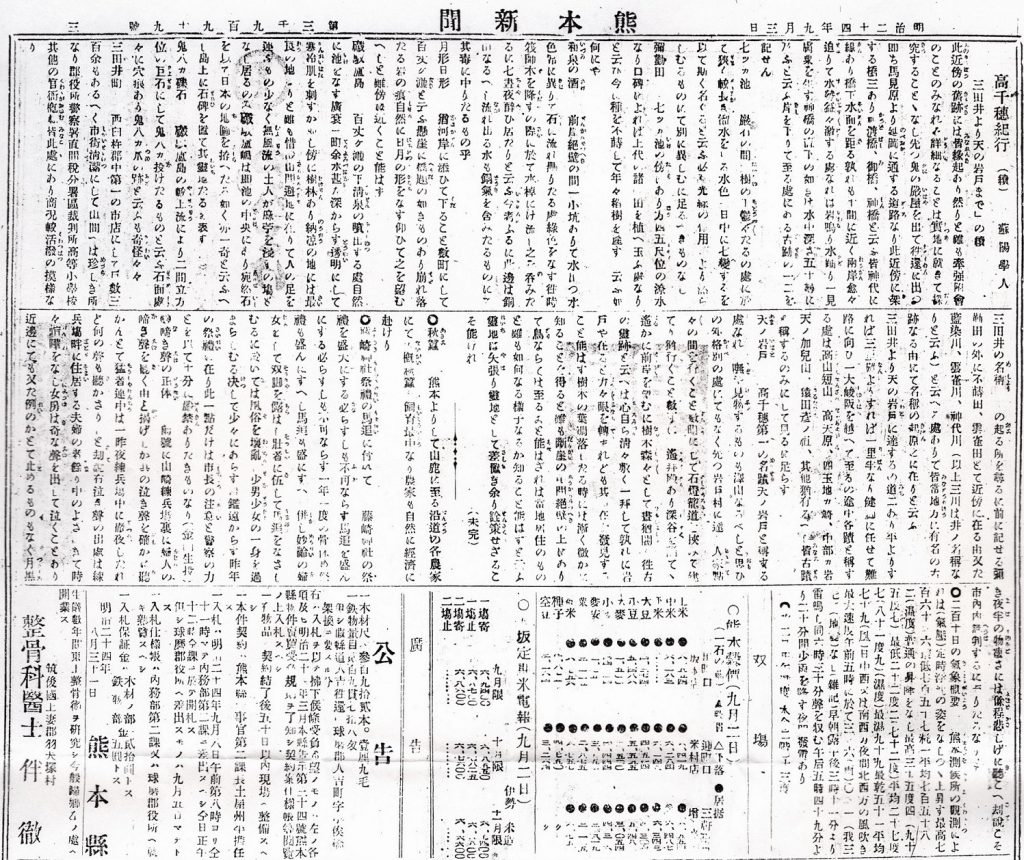 “Takachiho Travel Report” by Soyo Gakuto posted in the Kumamoto newspaper in 1891