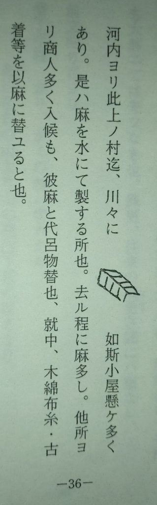 「河内ヨリ此上ノ村迄、川々に⛺️如斯小屋懸ケ多くあり、是ハ麻を水にて製する所也。
